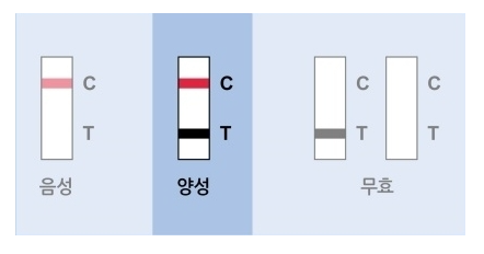 검사 결과, C에 빨간줄이 한 줄이면 음성이며, T에 검정줄이 생겨, C와 T 모두 줄이 생기면 양성입니다.