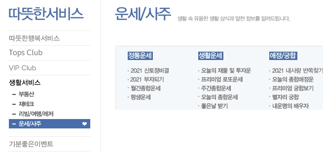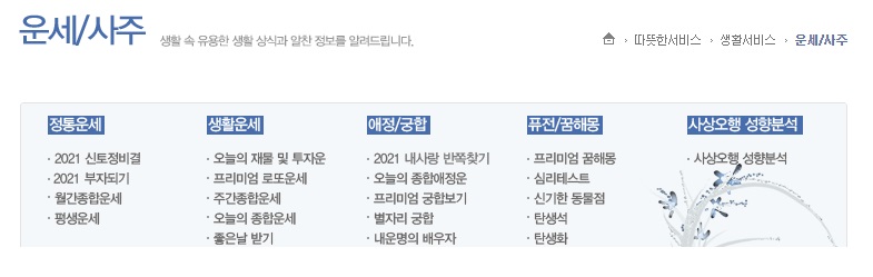 생활 서비스를 누르시면 화면이 바뀌는데, 이번에는 왼쪽에 있는 따뜻한 서비스 항목에서 부동산, 재테크, 리빙/여행/레저 코너 밑에 운세 사주항목을 클릭해주시면 됩니다. 얼마전에 2021 신토정비결, 2021 무료신년운세 서비스가 오픈되었어요!