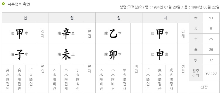 사주정보를 제공하는데, 자세히는 볼 줄 모르고, 맨 왼쪽에 제가 나무의 기운이 제일 많아서, 나무의 기운인 것 같아요.