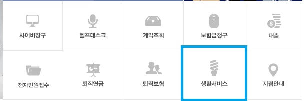 신한생명 웹사이트에 접속하시면 신한생명 사이버 창구, 헬프데스크 등 신한생명 서비스에 관련된 항목도 있지만, 아래쪽에 보시면 전구모양의 생활서비스가 있습니다.